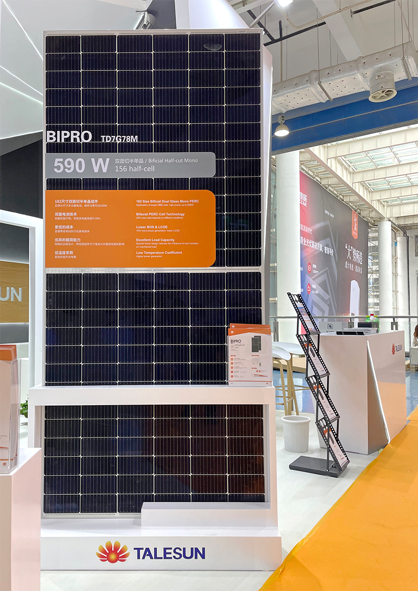 此次展出的“麒麟”组件产品叠加了182mm尺寸硅片、MBB多主栅设计、全新内部电路设计等多项创新型技术,组件功率最高达590W,采用的双面电池技术可应用于不同场景,为客户带来额外5%-25%的发电效益。此外,应用了腾晖光伏专利的PERX技术能显著提高组件抗隐裂能力和抗PID性能,降低电阻损耗,从而实现兼具高功率、高转换率、高可靠性的新型产品。