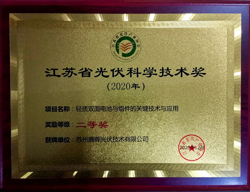 喜讯频传!腾晖光伏荣获2020年度江苏省光伏产业协会光伏科学技术奖二等奖!