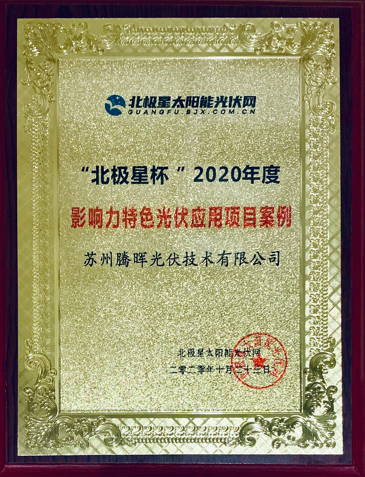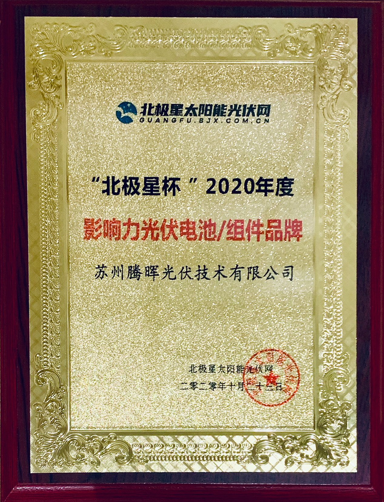 2020年10月23日,“北极星杯”2020光伏影响力品牌评选颁奖典礼在北京举办,经过激烈角逐,腾晖光伏从260多家入围企业中脱颖而出,荣膺2020影响力光伏电池/组件品牌,此外,阿根廷高查瑞315 MW光伏电站项目荣获“影响力特色光伏应用项目案例奖”。