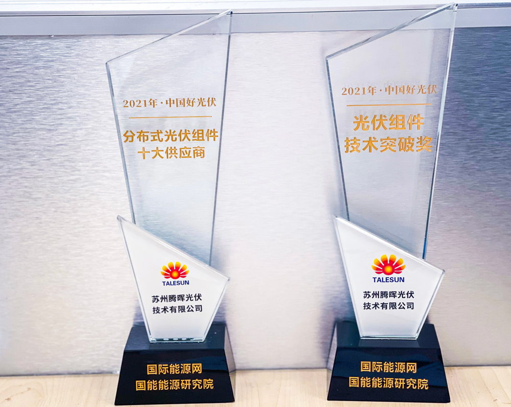 晚宴上,腾晖光伏荣获“2021年度分布式光伏组件十大供应商奖”和“2021年度光伏组件技术突破奖”。这两个奖项的获得是对腾晖光伏2021年度在光伏组件领域所做出的努力的肯定,也体现了腾晖光伏的行业品牌影响力。一直以来,腾晖光伏坚持用品质与创新迈向更高的台阶,公司将以本次获奖为契机,继续竭尽全力为客户提供最优质的产品和服务,共同维护光伏产业发展的行业口碑。努力为中国早日实现“碳中和”目标贡献力量!