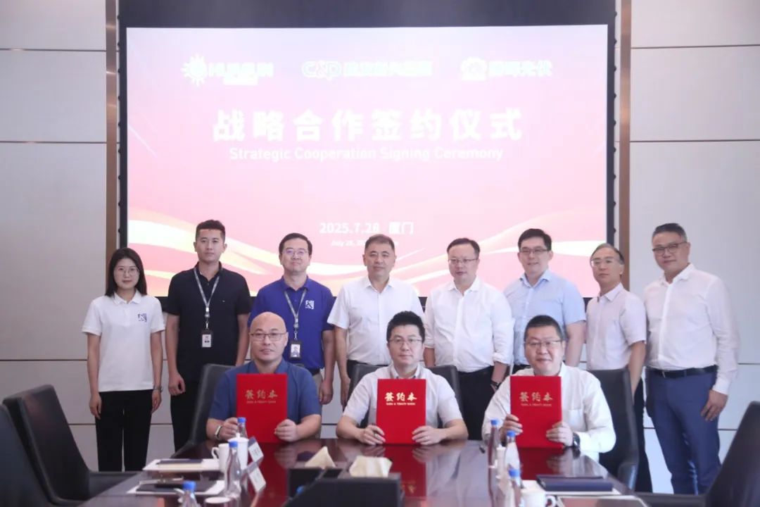 2025年7月28日,厦门建发新兴能源有限公司(以下简称“建发新兴能源”)、苏州腾晖光伏技术有限公司(以下简称“腾晖光伏”)与安徽华晟新能源科技股份有限公司(以下简称“华晟新能源”)在厦门建发集团总部签署三方战略合作协议。此次合作的核心在于引入华晟新能源先进的异质结(HJT)技术这一“新质生产力”,旨在显著提升腾晖光伏的技术实力与产品竞争力,实现关键突破。厦门建发股份有限公司(以下简称“建发股份”)副总经理、中利集团股份有限公司(以下简称“中利集团”)董事长许加纳、建发新兴能源总经理、腾晖光伏董事长黄昶、华晟新能源副总裁梁海彬分别代表三方签署协议。建发股份董事长林茂、华晟新能源董事长徐晓华等领导共同见证签约。
