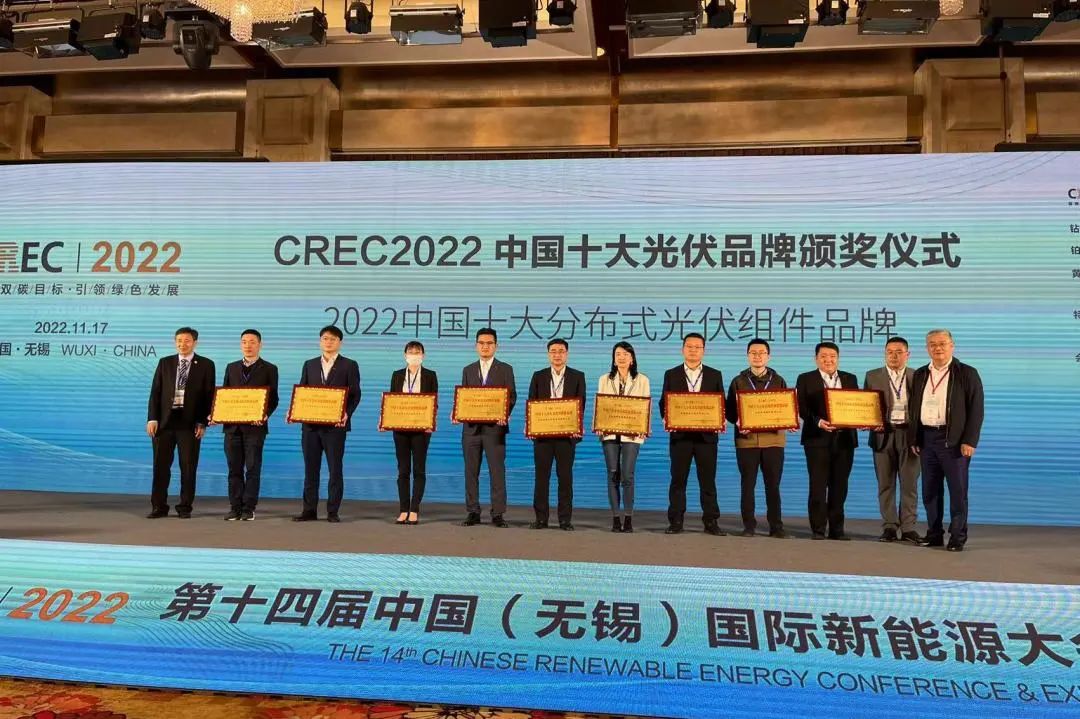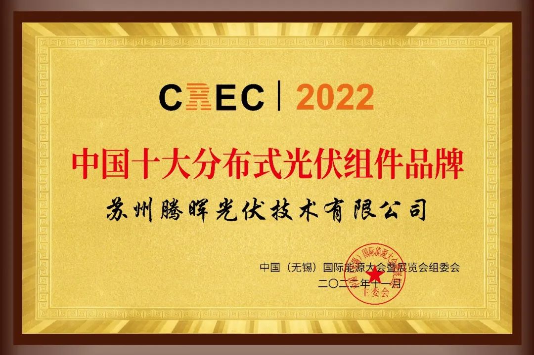 同期,由中国(无锡)国际新能源大会暨展览会(CREC)组委会举办的“中国十大分布式光伏品牌评选”活动在颁奖典礼现场正式公布获奖企业榜单,腾晖光伏再次榜上有名,至此,腾晖光伏已数次荣获“中国十大分布式光伏组件品牌”称号。