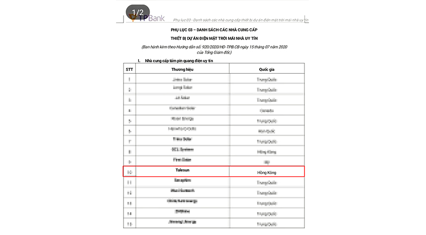 近日,越南军队银行(MB)、越南工商商业股份银行(VietinBank) 、越南先锋商业股份银行(TPBank)三家越南当地银行相继公布了越南光伏项目投融资公告,腾晖光伏均列名榜上。这意味着,选用腾晖光伏组件的项目将更容易获得越南当地银行融资和无追索权贷款,这将吸引更多当地的大型光伏电站项目采购腾晖光伏组件,助力组件销售业务和项目开发业务的拓展。
