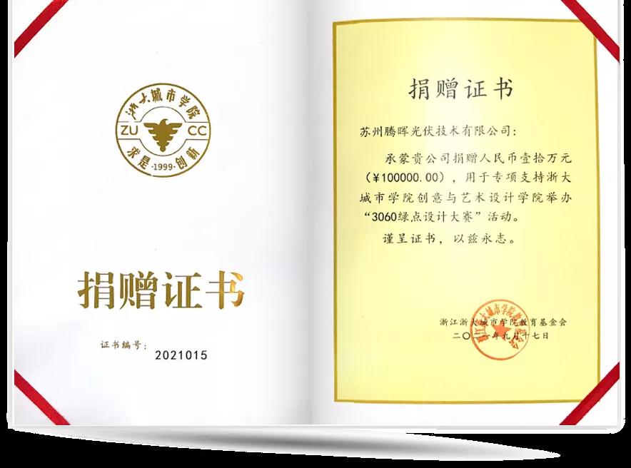 近日,腾晖光伏向浙大城市学院捐资十万元,专项支持该校3060绿点设计创新大赛活动。此外,双方还将在清洁能源推广与应用、创新人才培养和能源科技成果转化等多个领域深化合作关系。