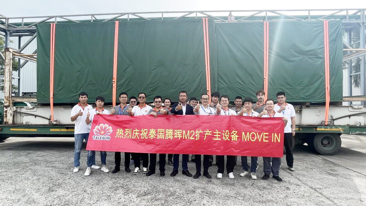 2023年10月31日9时整,腾晖光伏泰国生产基地M2组件车间首批光伏主产设备顺利进厂。基地董事长徐胜文、总经理方亮与各部门员工齐聚,一起见证了这激动人心值得纪念的里程碑时刻。新设备的到厂为正在满负荷生产的组件车间注入了新活力、新动能!
