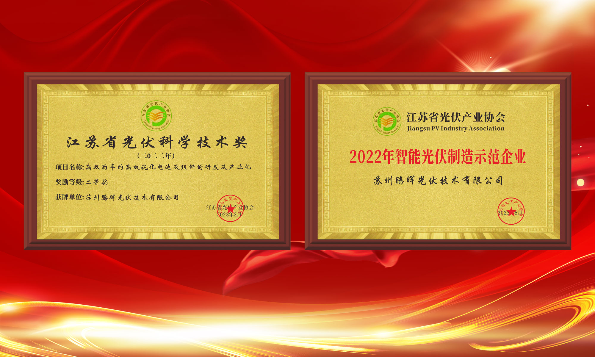 腾晖光伏荣获“2022年智能光伏制造示范企业”及“江苏省光伏科学技术奖”两项殊荣!