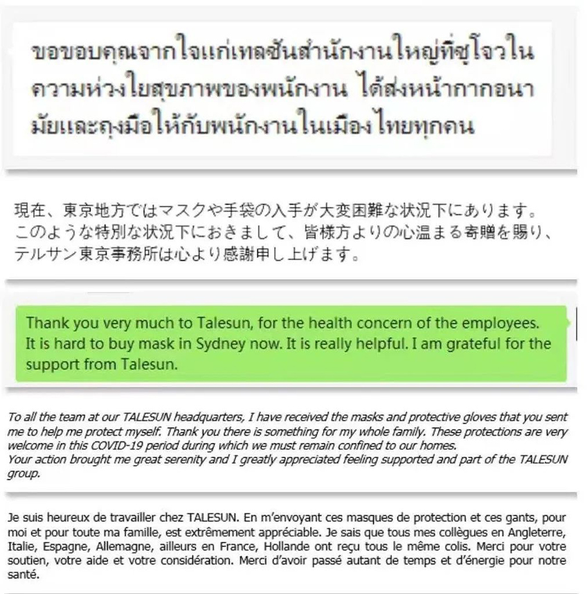 除了捐赠防疫物资, 腾晖光伏还为海外员工培训了公司应对新冠肺炎疫情所采取的防控措施和经验,着力做好海外员工思想引导、心理疏导、困难帮扶工作,确保了海外员工队伍稳定,施工生产有序,用温暖的人文关怀筑起海外疫情防控的坚强屏障。在收到公司寄送的防疫物资后,身处各国的腾晖员工纷纷发来电子邮件,简短的话语情真意切,道出了对公司的感谢。