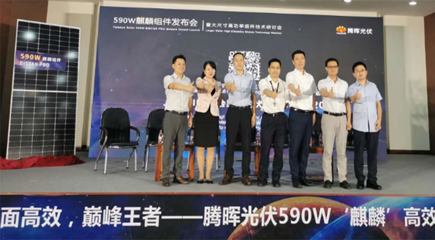 2020年8月4日,腾晖光伏举行新品全球线上发布会,公司最新研发的“麒麟”超高功率组件正式亮相。该组件基于先进的PERX技术,成熟应用182mm硅片,采用多主栅半片密排设计,单片功率可达590W,问鼎500W+功率段巅峰王者。