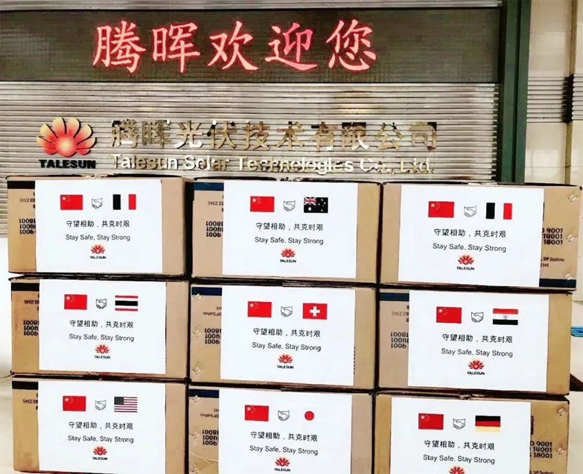 2020年3月海外疫情形势日益严峻,腾晖光伏时刻牵挂着全球各地的员工安全。公司克服医用物资短缺、国外物流不畅、物流成本增加等种种困难,为身处海外的员工输送防疫物资,向意大利、乌克兰、德国、瑞工捐赠口罩、护目镜、一次性手套等防护物资,保障海外员工安全防疫。士、法国、印度、曼谷、悉尼、东京、福冈、纽约、加州等几十个地区的员工捐赠口罩、护目镜、一次性手套等防护物资,保障海外员工安全防疫。