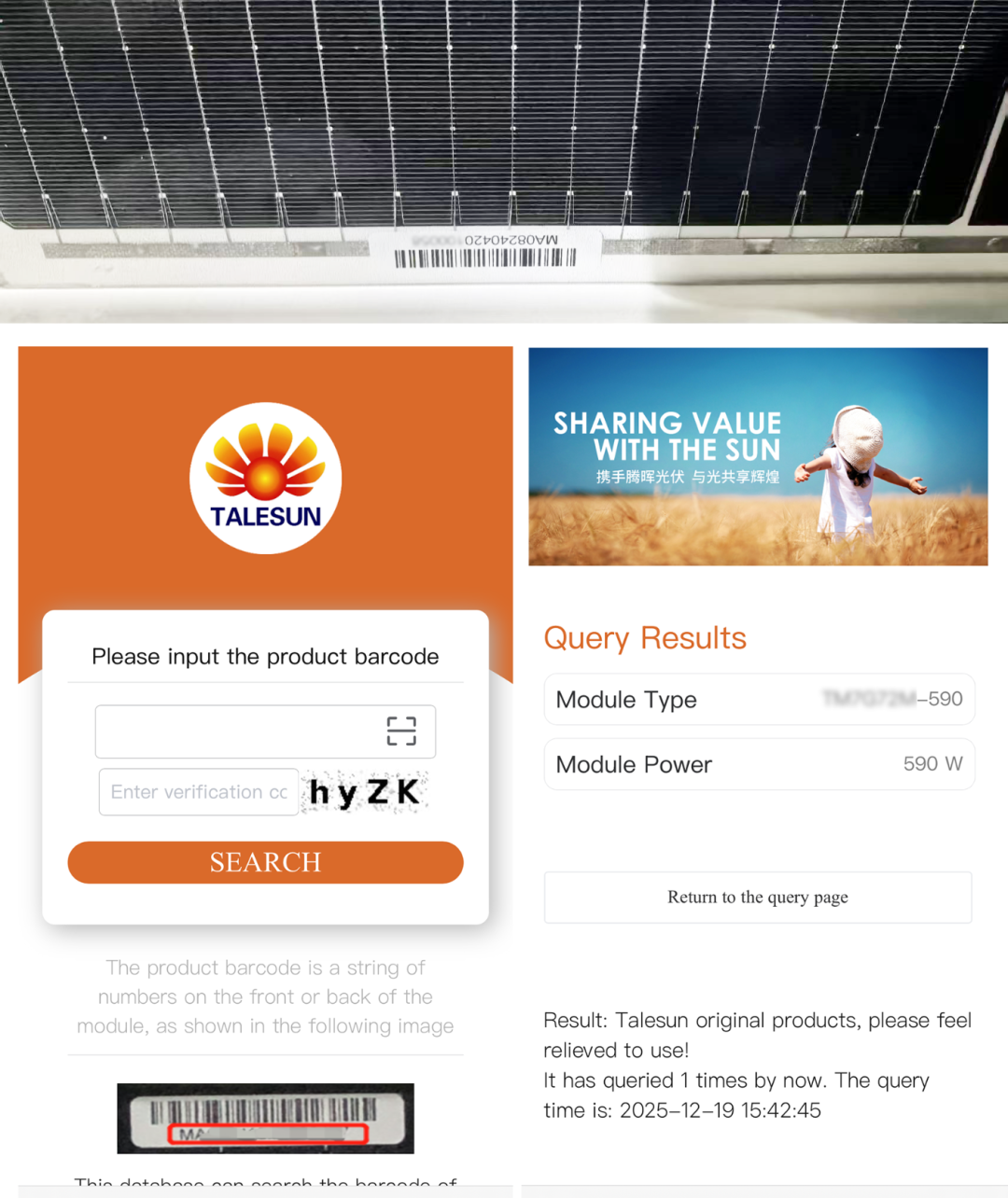 We sincerely invite all partners and customers to experience this new anti-counterfeit verification service. In the future, Talesun Solar will continue to deepen innovation in products and services, contributing to the global clean energy cause with more reliable products and a more transparent trust mechanism.